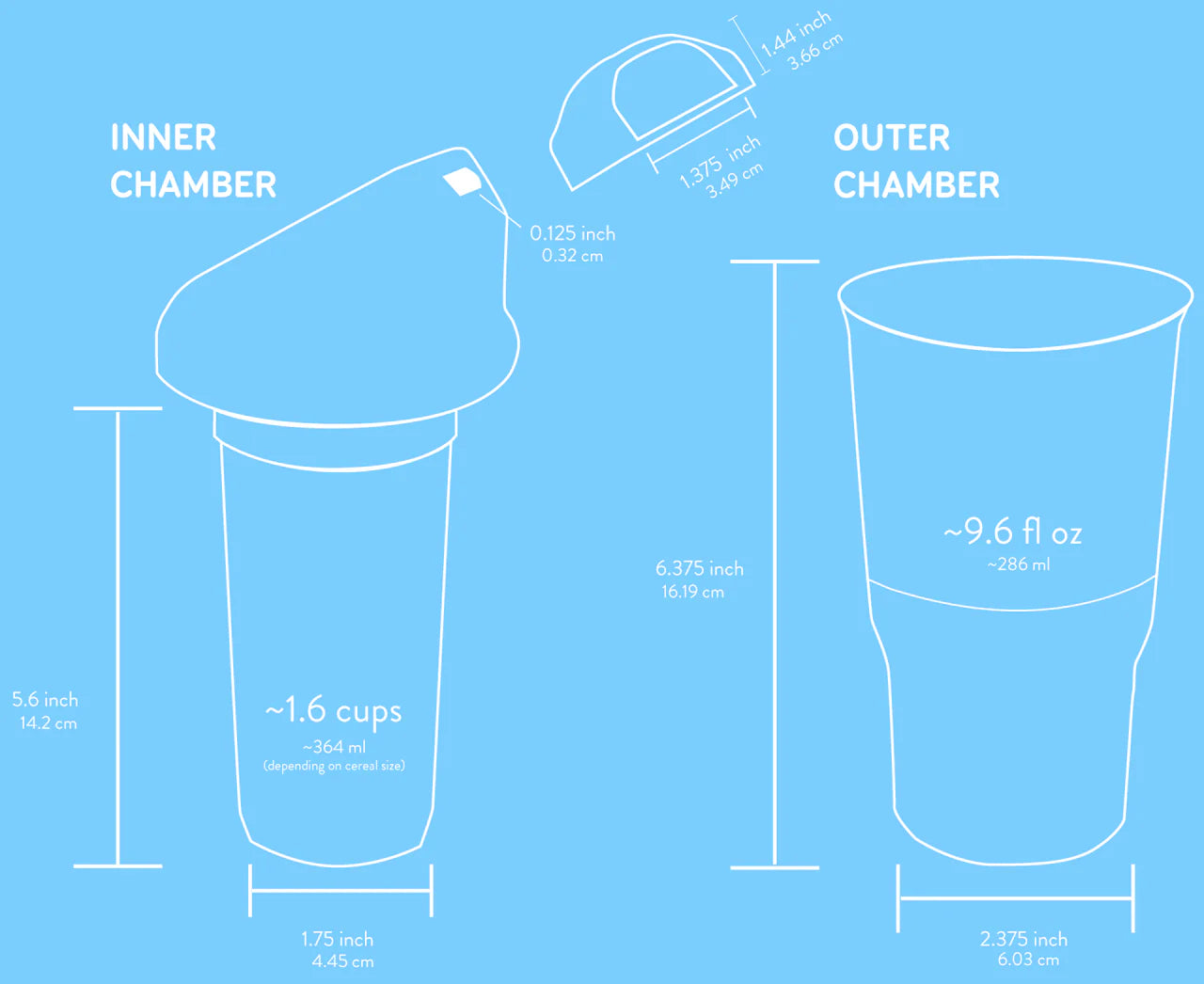 Say goodbye to soggy cereal, The CrunchCup® keeps your cereal crunchy. Simply add cereal to the inner cup, milk into the outer cup, screw on the lid, and you're ready to crunch. The milk and cereal don't meet until it's time to eat.